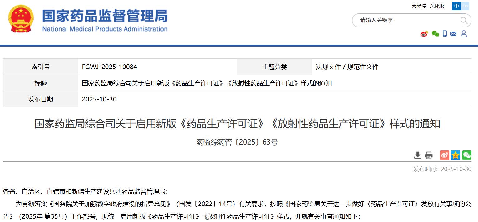 国家药监局综合司关于启用新版《药品生产许可证》《放射性药品生产许可证》样式的通知