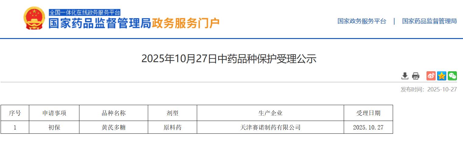 2025年10月27日中药品种保护受理公示