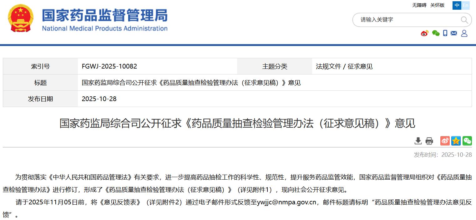 国家药监局综合司公开征求《药品质量抽查检验管理办法(征求意见稿)》意见