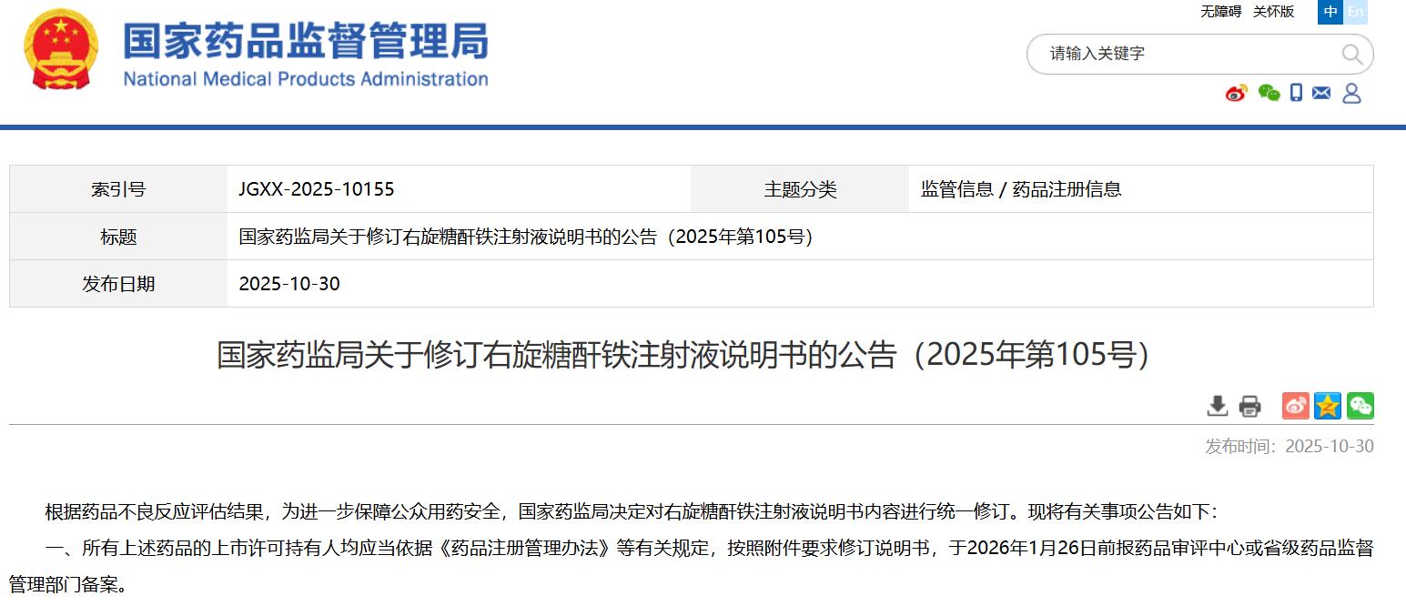 国家药监局关于修订右旋糖酐铁注射液说明书的公告(2025年第105号)