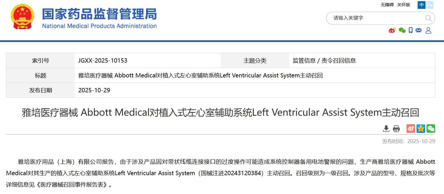 雅培医疗器械 Abbott Medical对植入式左心室辅助系统Left Ventricular Assist System主动召回