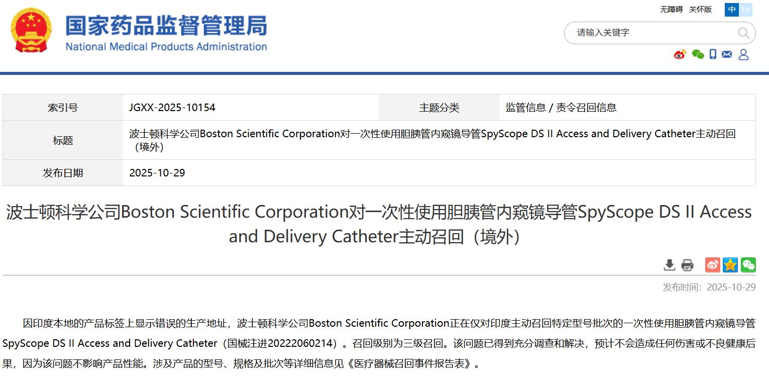 波士顿科学公司Boston Scientific Corporation对一次性使用胆胰管内窥镜导管SpyScope DS II Access and Delivery Catheter主动召回(境外)
