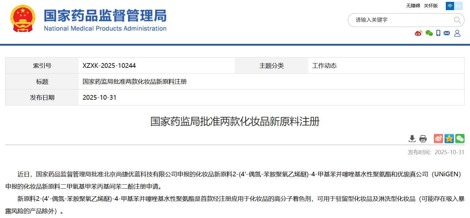 国家药监局批准两款化妆品新原料注册