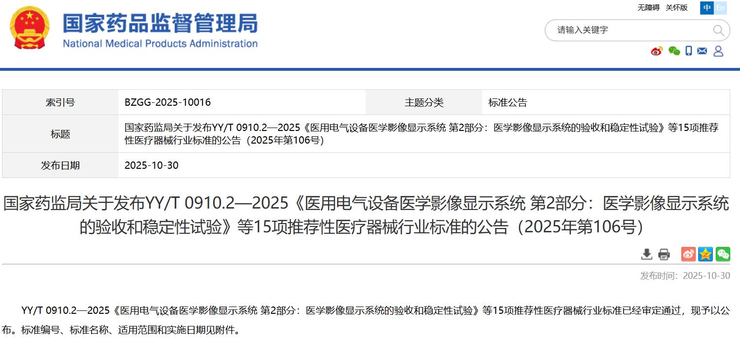 国家药监局关于发布YY/T 0910.2—2025《医用电气设备医学影像显示系统 第2部分:医学影像显示系统的验收和稳定性试验》等15项推荐性医疗器械行业标准的公告(2025年第106号)