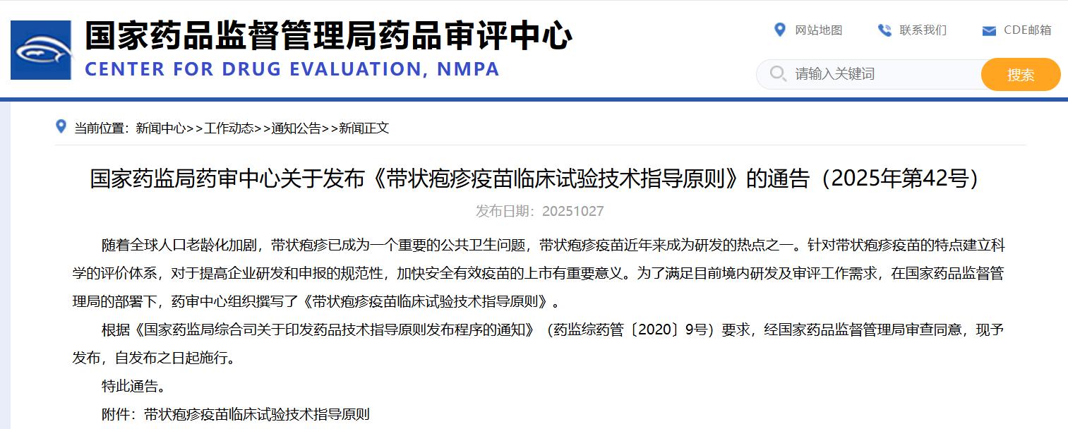 国家药监局药审中心关于发布《带状疱疹疫苗临床试验技术指导原则》的通告(2025年第42号)