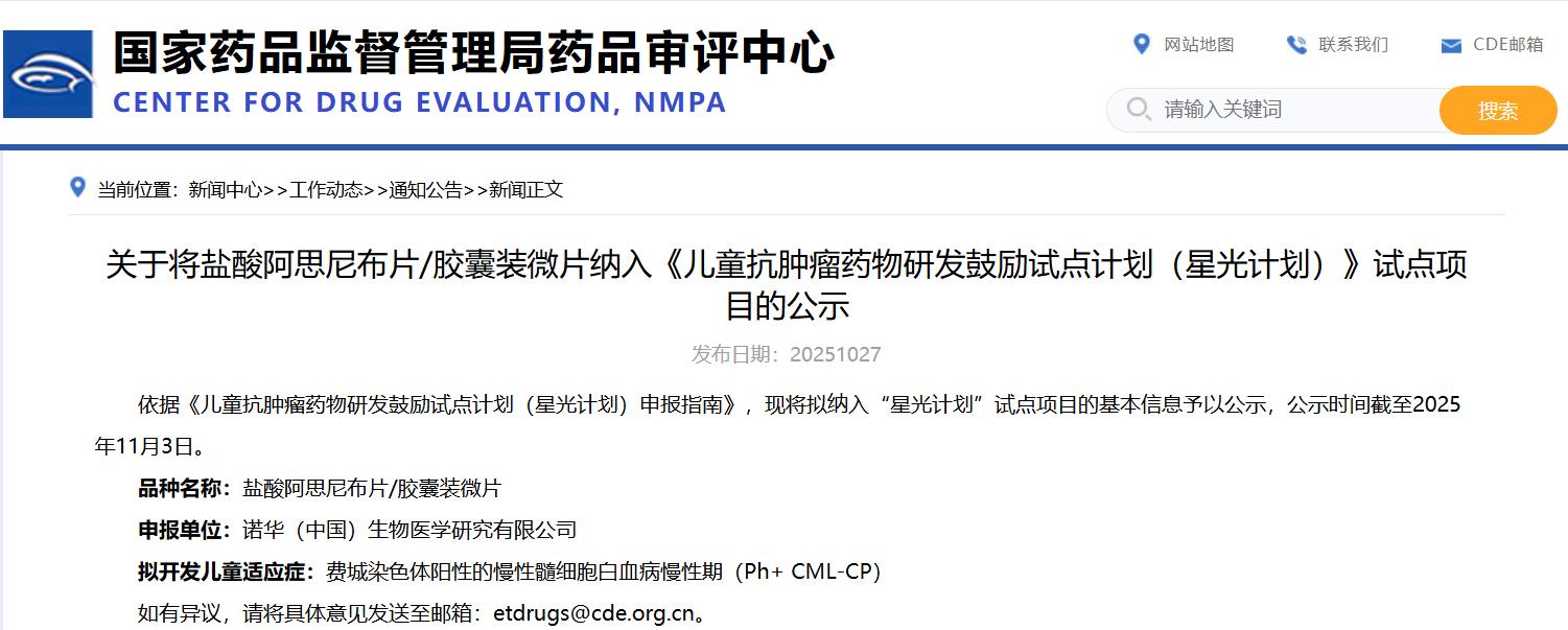 关于将盐酸阿思尼布片/胶囊装微片纳入《儿童抗肿瘤药物研发鼓励试点计划(星光计划)》试点项目的公示