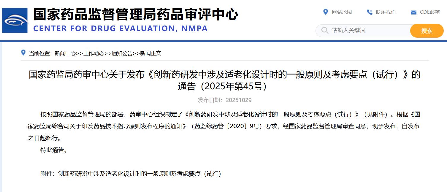 国家药监局药审中心关于发布《创新药研发中涉及适老化设计时的一般原则及考虑要点(试行)》的通告(2025年第45号)