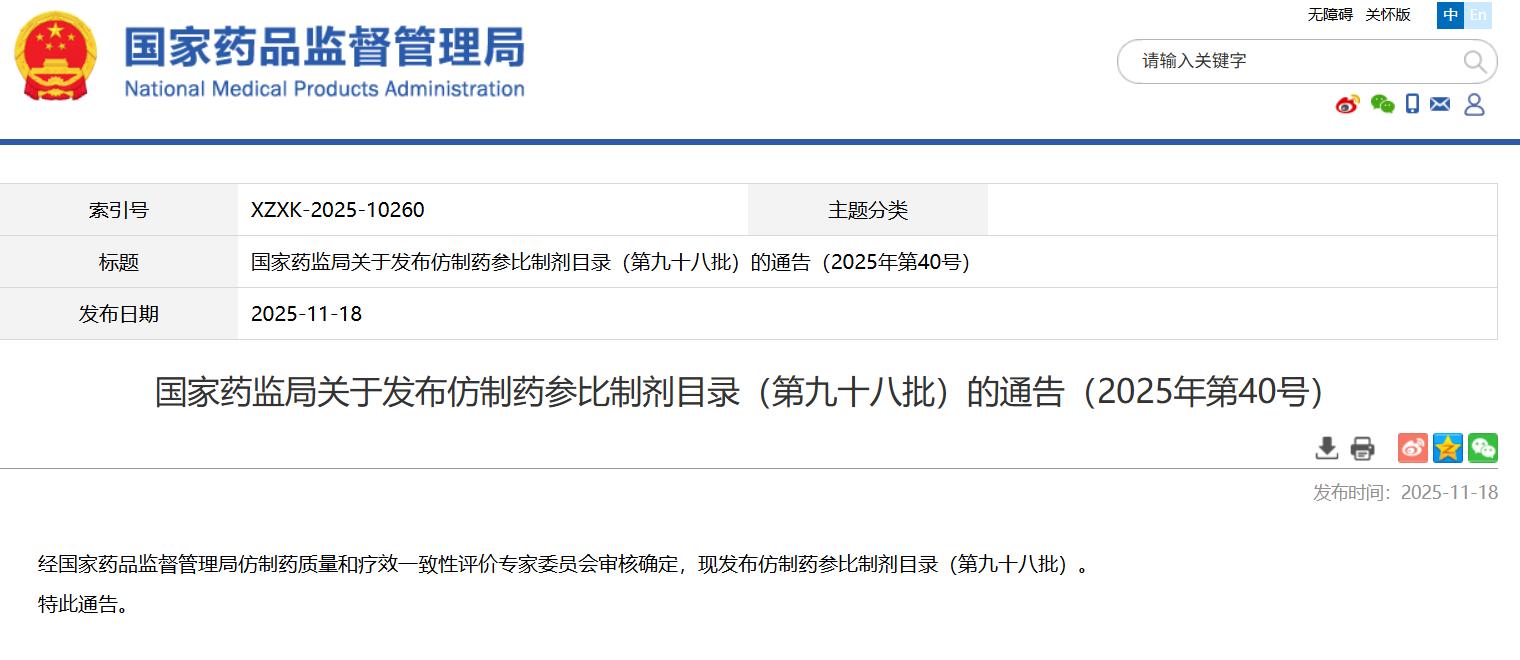 国家药监局关于发布仿制药参比制剂目录(第九十八批)的通告(2025年第40号)