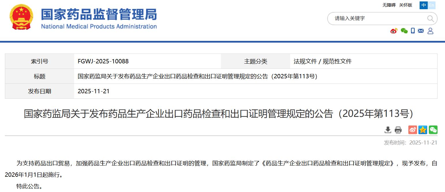 国家药监局关于发布药品生产企业出口药品检查和出口证明管理规定的公告(2025年第113号)