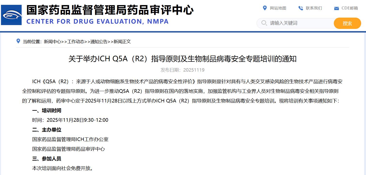 关于举办ICH Q5A(R2)指导原则及生物制品病毒安全专题培训的通知