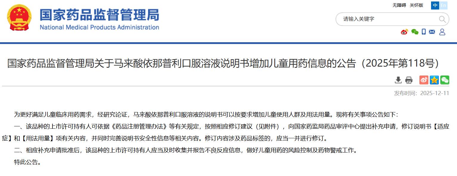 国家药品监督管理局关于马来酸依那普利口服溶液说明书增加儿童用药信息的公告(2025年第118号)