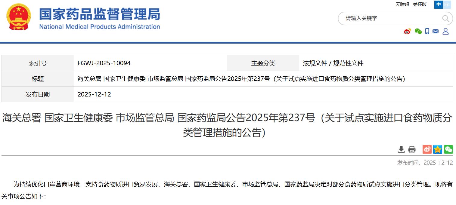 海关总署 国家卫生健康委 市场监管总局 国家药监局公告2025年第237号(关于试点实施进口食药物质分类管理措施的公告)
