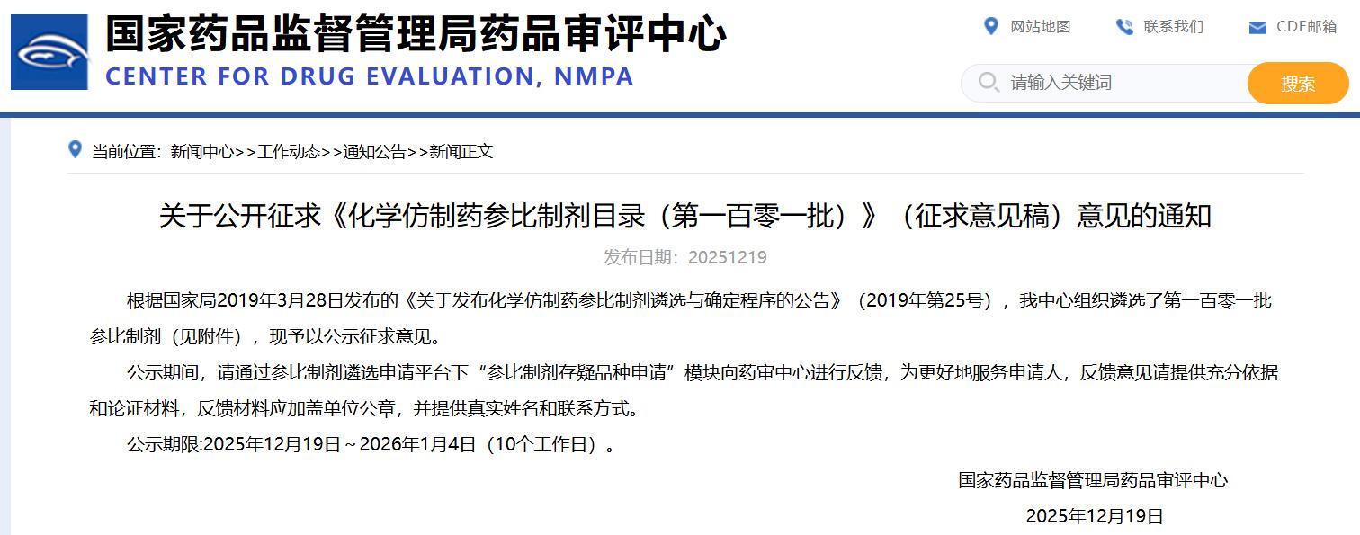 关于公开征求《化学仿制药参比制剂目录(第一百零一批)》(征求意见稿)意见的通知