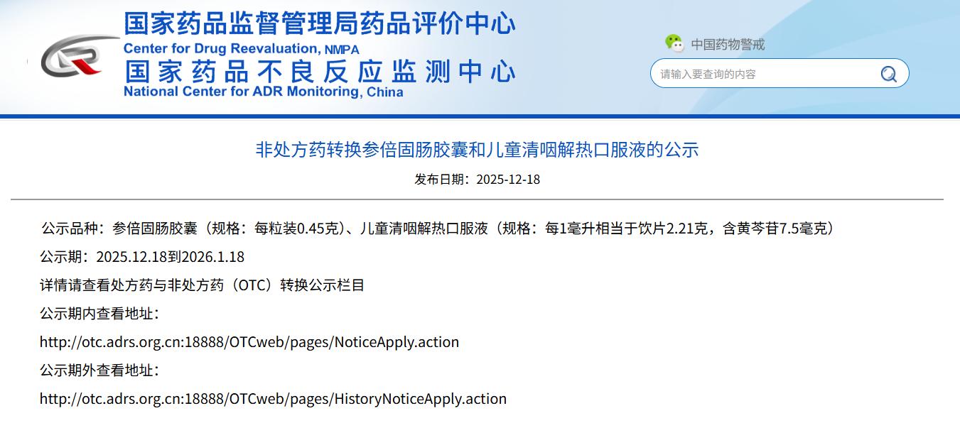 非处方药转换参倍固肠胶囊和儿童清咽解热口服液的公示