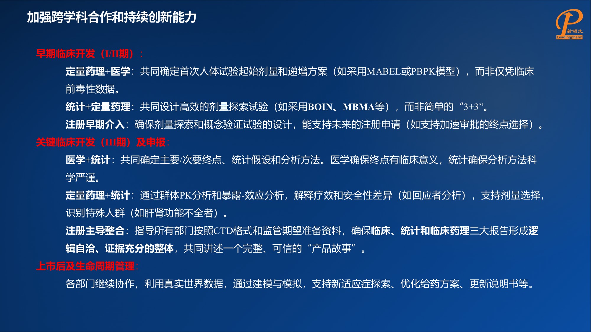 跨学科合作与持续创新能力是临床开发成功的重要支撑。早期临床开发阶段,定量药理、医学、统计协同确定起始剂量与试验方案,注册部门提前介入保障设计符合注册要求;关键开发及申报阶段,医学与统计明确试验终点与分析方法,定量药理助力剂量选择与特殊人群识别,注册部门主导整合资料形成完整 “产品故事”。