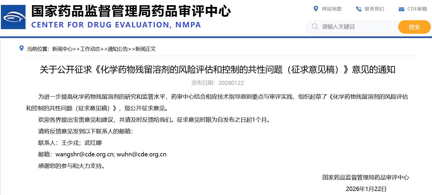 关于公开征求《化学药物残留溶剂的风险评估和控制的共性问题(征求意见稿)》意见的通知
