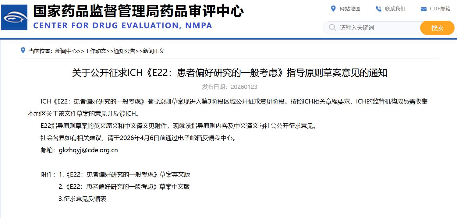 关于公开征求ICH《E22:患者偏好研究的一般考虑》指导原则草案意见的通知