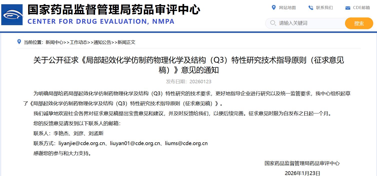 关于公开征求《局部起效化学仿制药物理化学及结构(Q3)特性研究技术指导原则(征求意见稿)》意见的通知