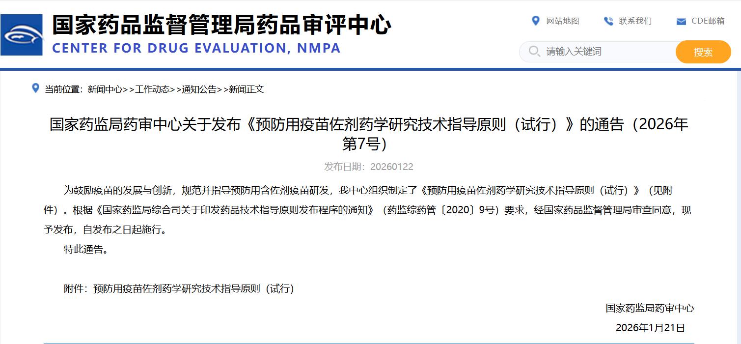 国家药监局药审中心关于发布《预防用疫苗佐剂药学研究技术指导原则(试行)》的通告(2026年第7号)