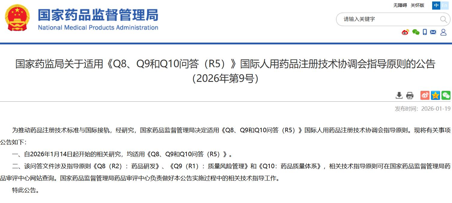 国家药监局关于适用《Q8、Q9和Q10问答(R5)》国际人用药品注册技术协调会指导原则的公告(2026年第9号)