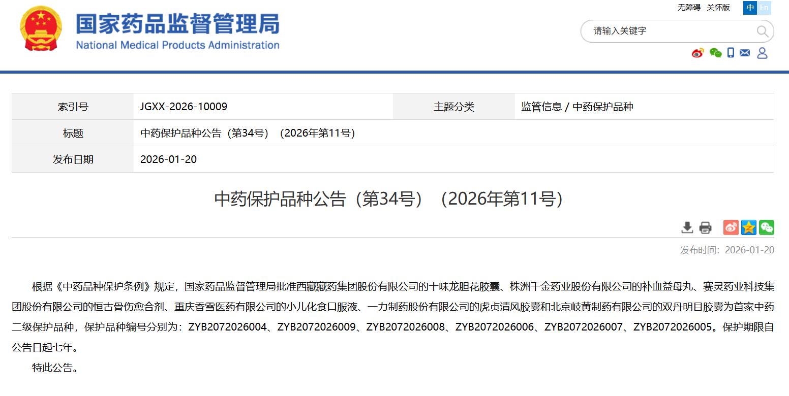 中药保护品种公告(第34号)(2026年第11号)