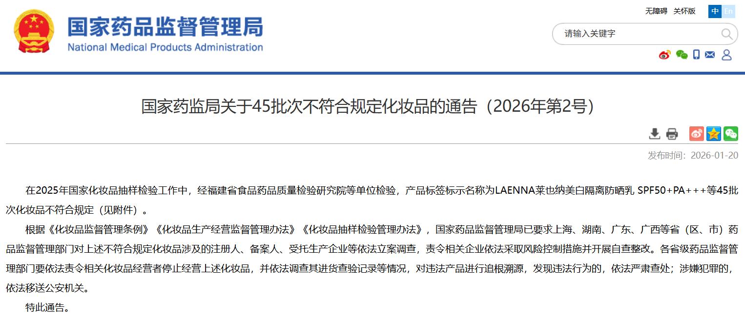 国家药监局关于45批次不符合规定化妆品的通告(2026年第2号)
