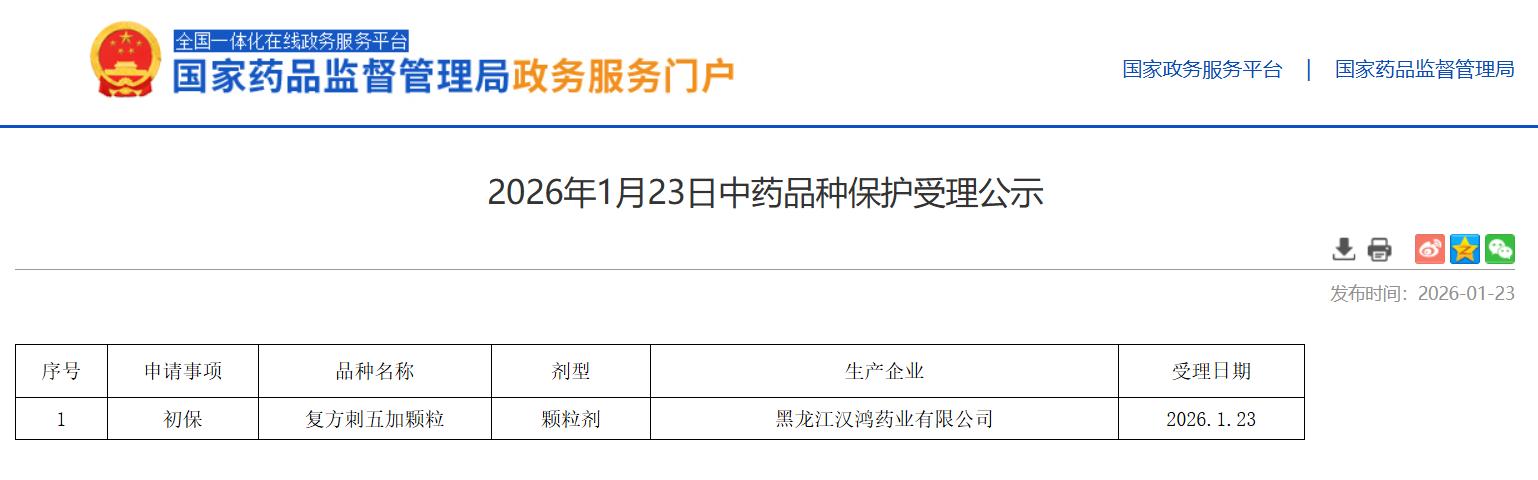 2026年1月23日中药品种保护受理公示