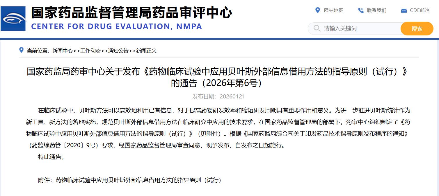 国家药监局药审中心关于发布《药物临床试验中应用贝叶斯外部信息借用方法的指导原则(试行)》的通告(2026年第6号)