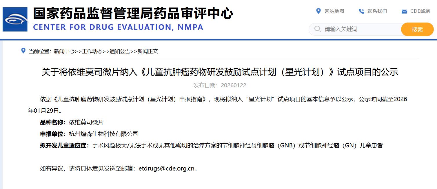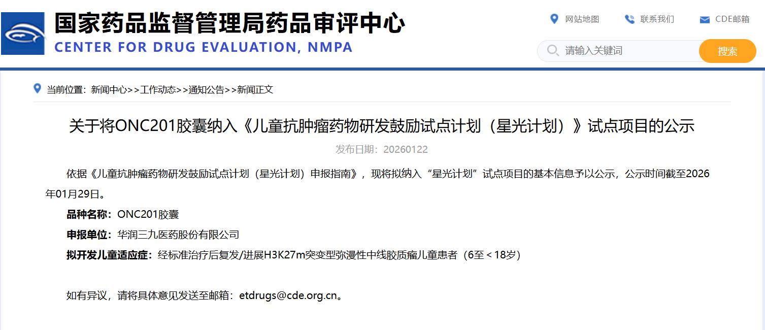 关于将ONC201胶囊纳入《儿童抗肿瘤药物研发鼓励试点计划(星光计划)》试点项目的公示