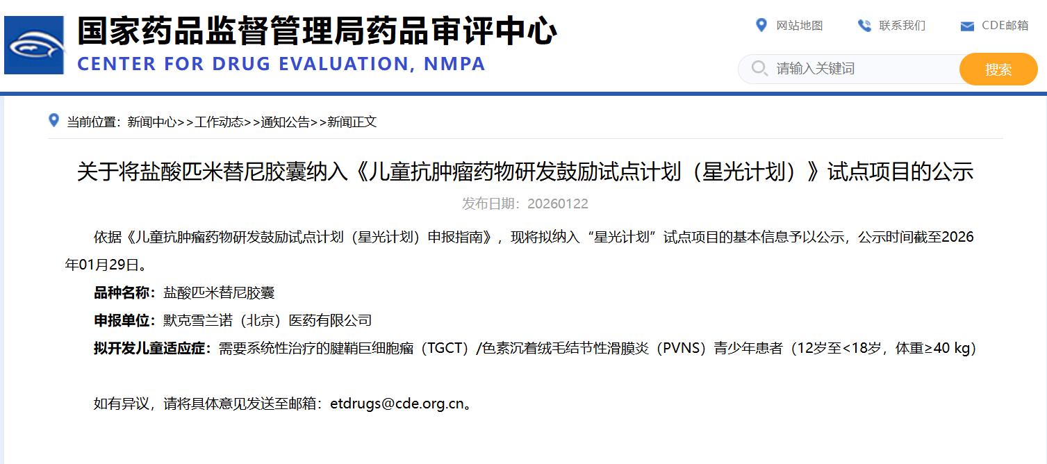 关于将盐酸匹米替尼胶囊纳入《儿童抗肿瘤药物研发鼓励试点计划(星光计划)》试点项目的公示