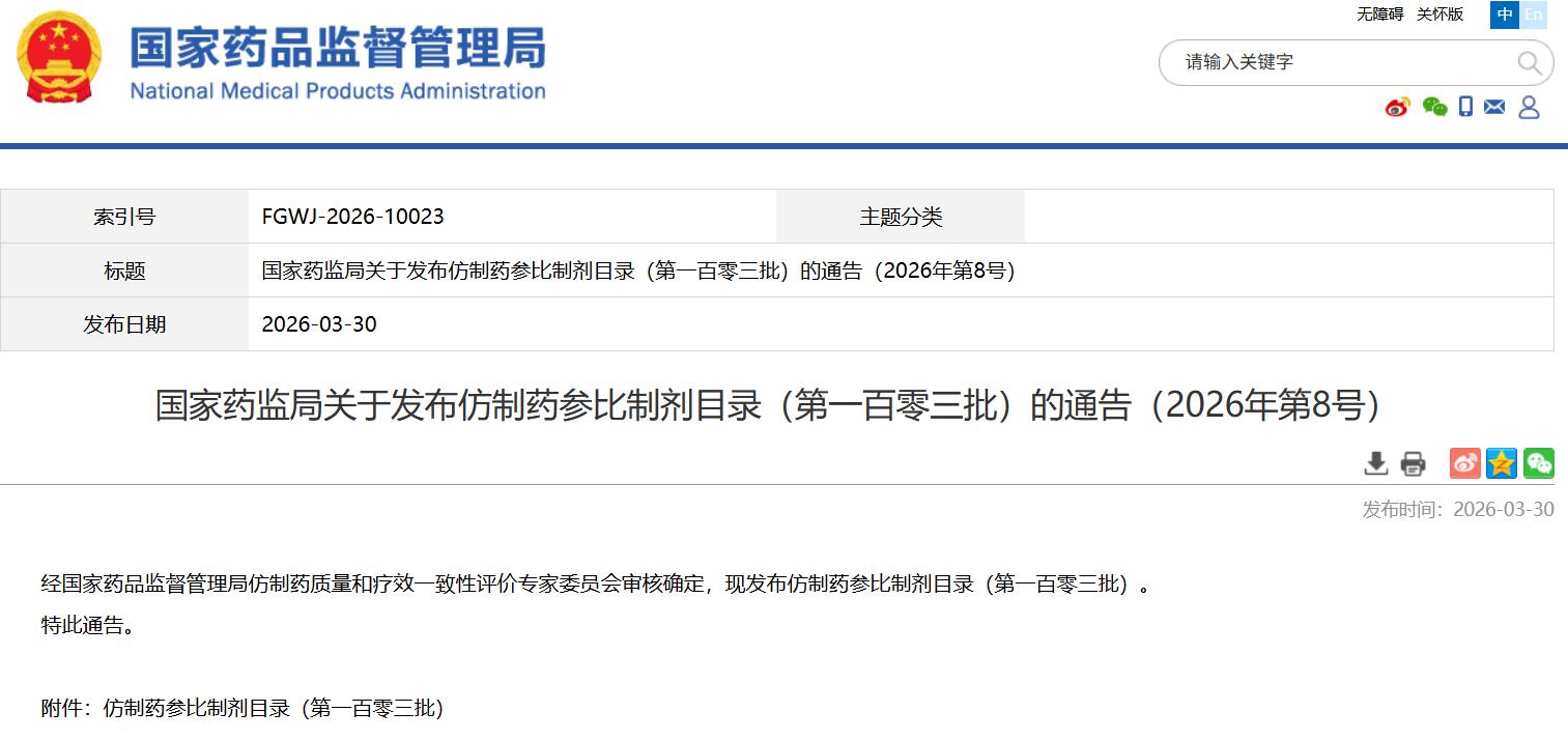 国家药监局关于发布仿制药参比制剂目录(第一百零三批)的通告(2026年第8号)