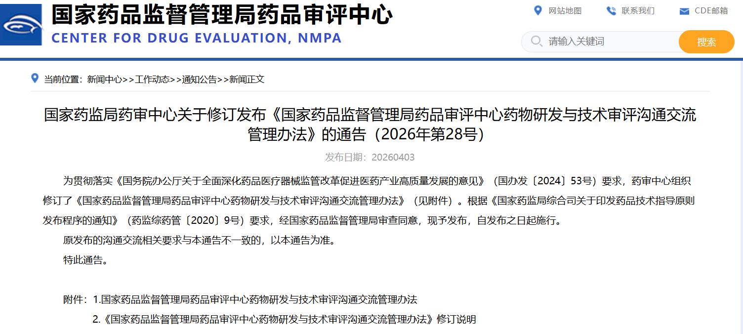 国家药监局药审中心关于修订发布《国家药品监督管理局药品审评中心药物研发与技术审评沟通交流管理办法》的通告(2026年第28号)