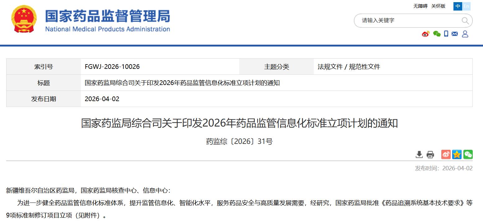 国家药监局综合司关于印发2026年药品监管信息化标准立项计划的通知