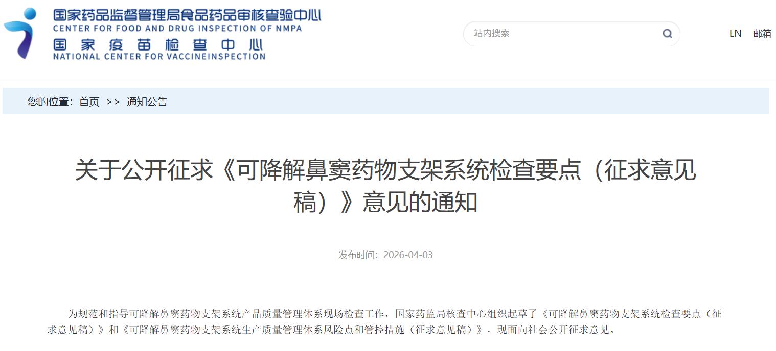 关于公开征求《可降解鼻窦药物支架系统检查要点(征求意见稿)》意见的通知