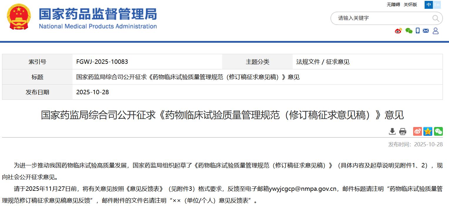 国家药监局综合司公开征求《药物临床试验质量管理规范(修订稿征求意见稿)》意见