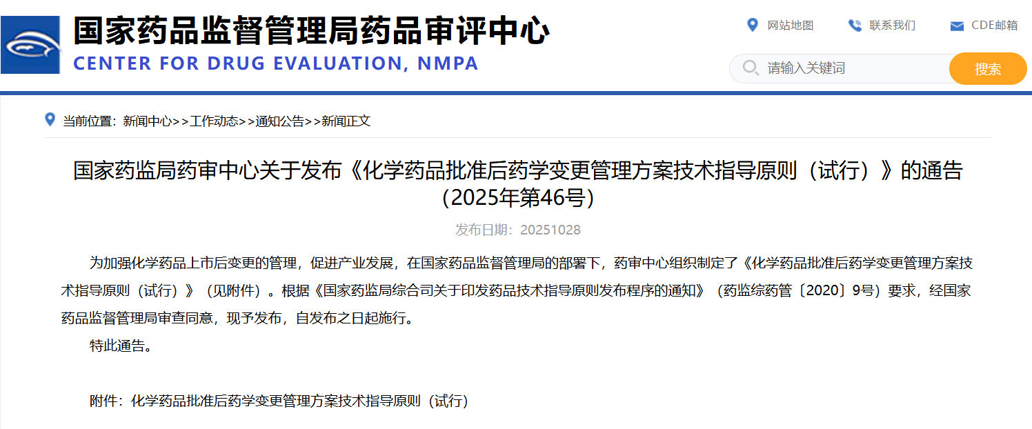 国家药监局药审中心关于发布《化学药品批准后药学变更管理方案技术指导原则(试行)》的通告(2025年第46号)