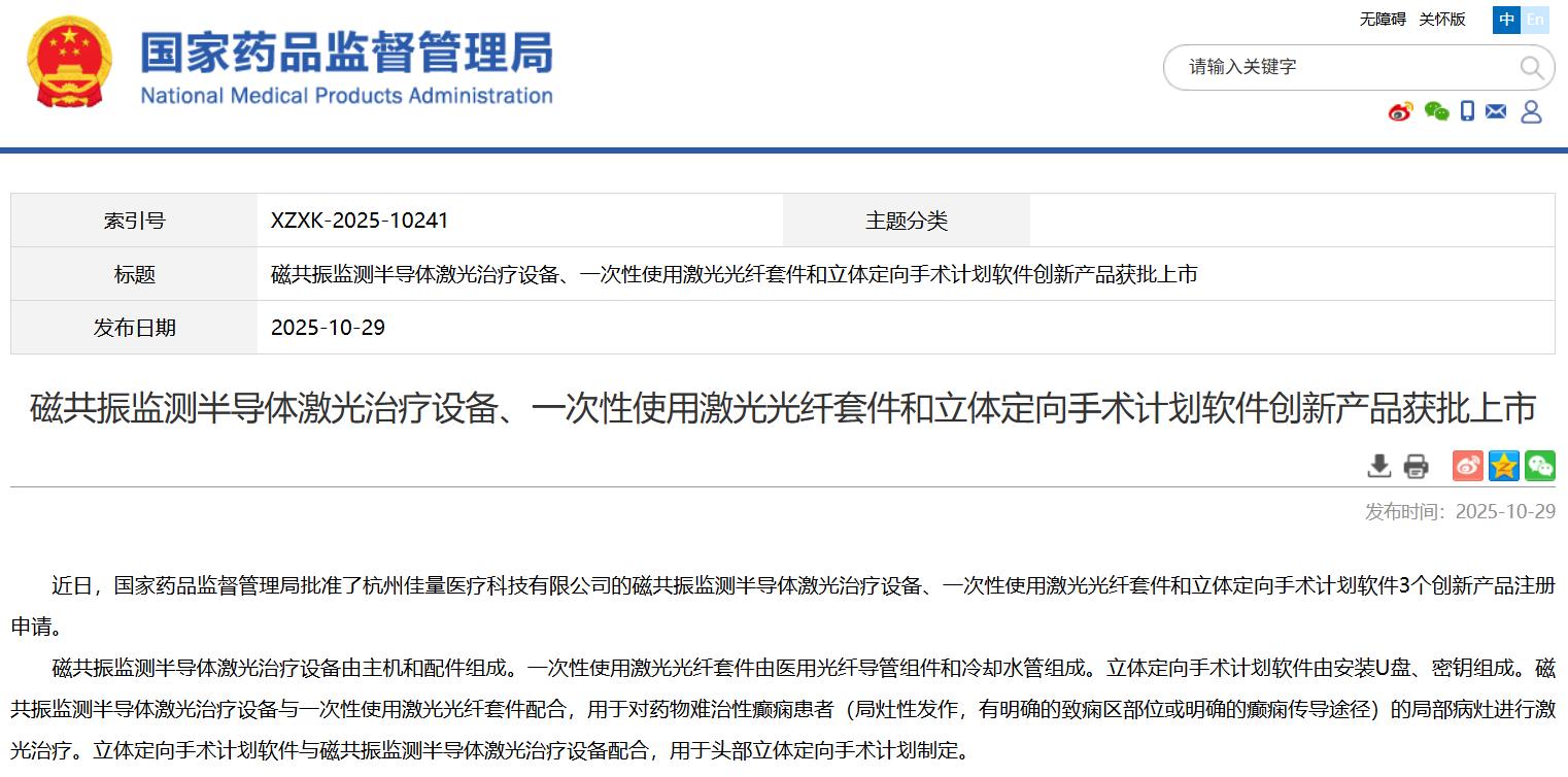 磁共振监测半导体激光治疗设备、一次性使用激光光纤套件和立体定向手术计划软件创新产品获批上市