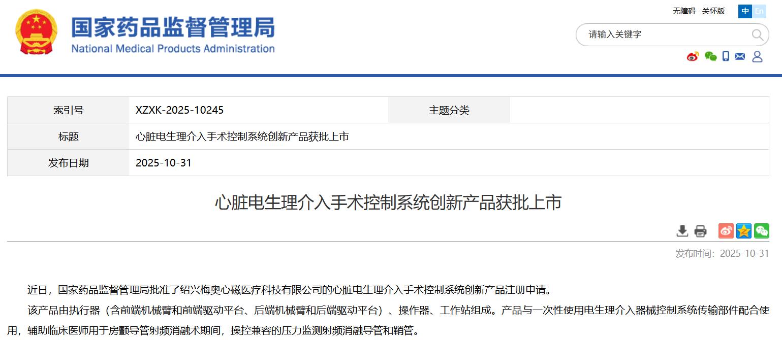 心脏电生理介入手术控制系统创新产品获批上市