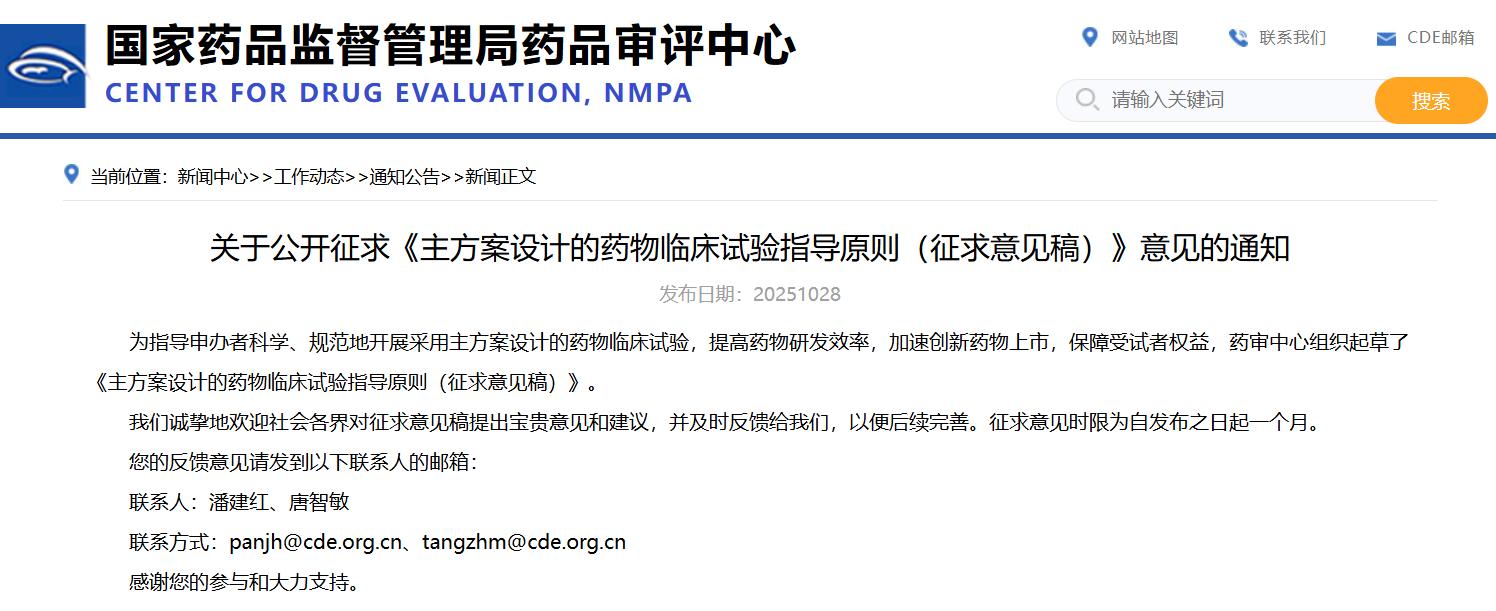 关于公开征求《主方案设计的药物临床试验指导原则(征求意见稿)》意见的通知