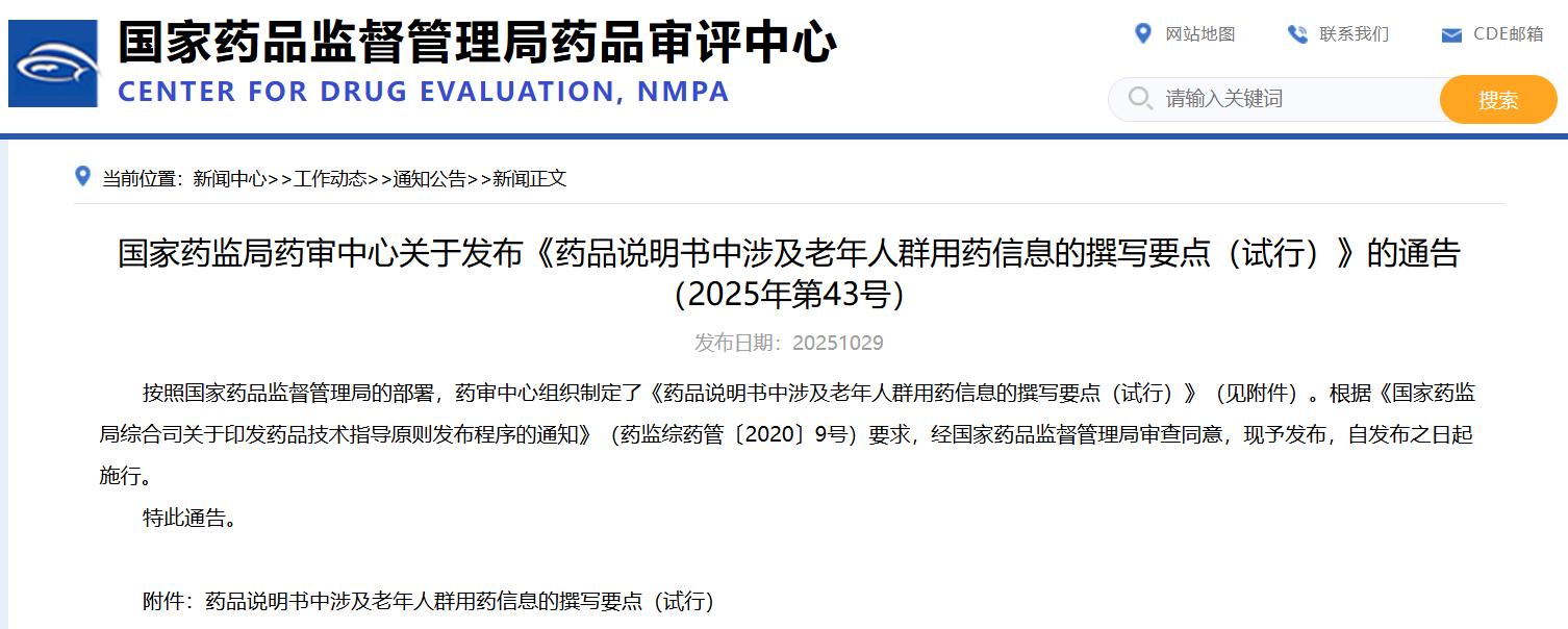 国家药监局药审中心关于发布《药品说明书中涉及老年人群用药信息的撰写要点(试行)》的通告(2025年第43号)