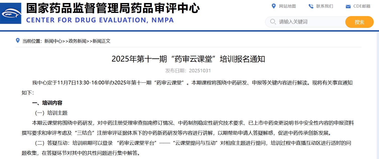 2025年第十一期“药审云课堂”培训报名通知