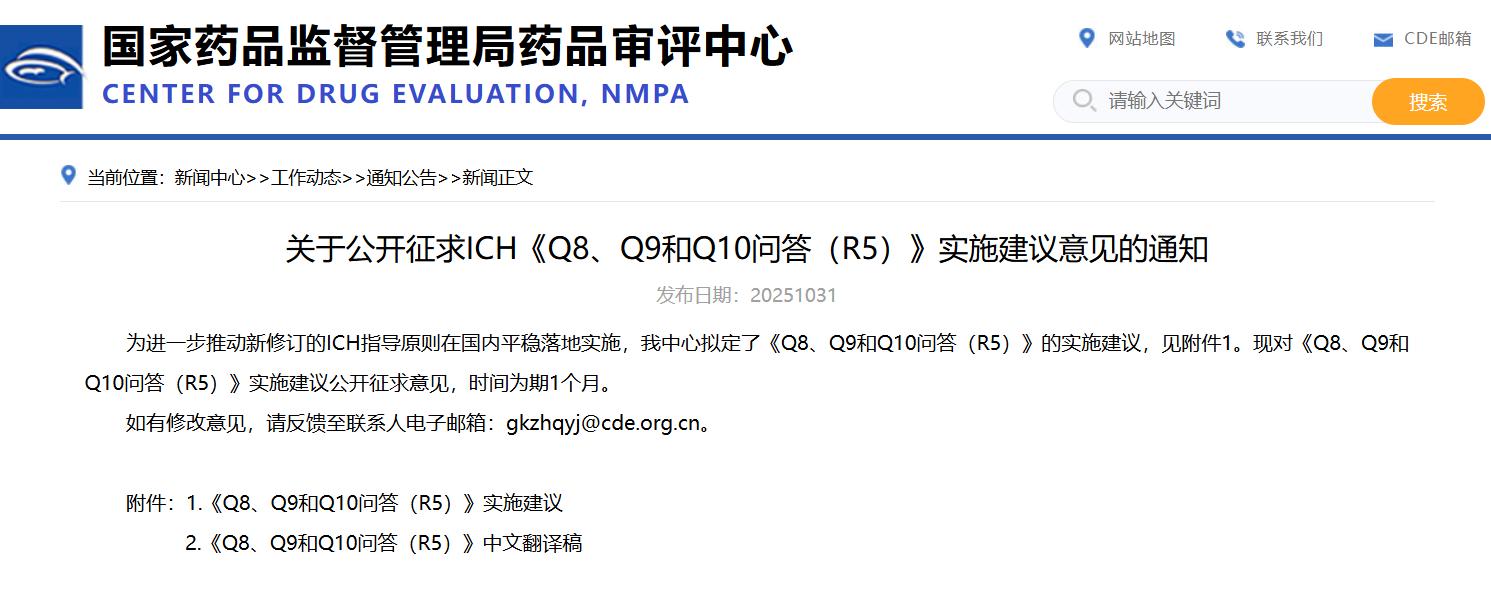 关于公开征求ICH《Q8、Q9和Q10问答(R5)》实施建议意见的通知