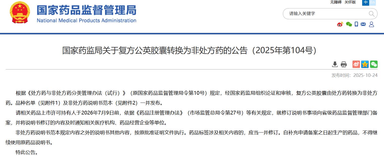 国家药监局关于复方公英胶囊转换为非处方药的公告(2025年第104号)