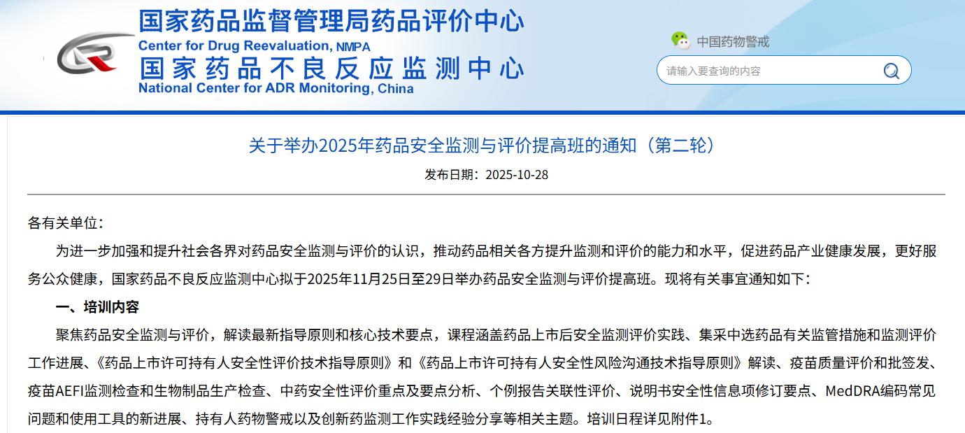 关于举办2025年药品安全监测与评价提高班的通知(第二轮)