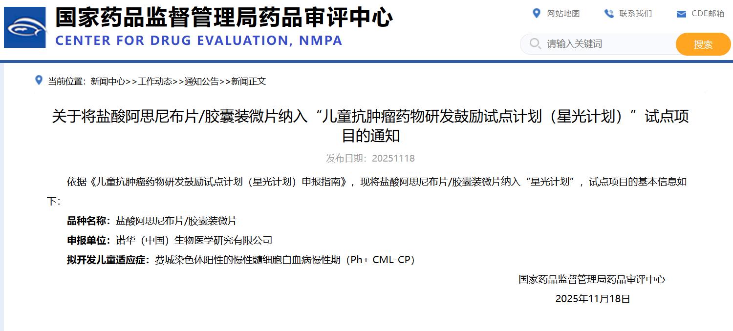 关于将盐酸阿思尼布片/胶囊装微片纳入“儿童抗肿瘤药物研发鼓励试点计划(星光计划)”试点项目的通知