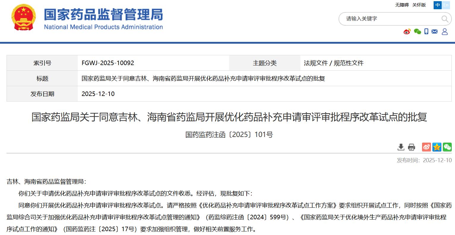 政策法规 || 关于同意吉林、海南省药监局开展优化药品补充申请审评审批程序改革试点的批复《(附法规概览12.8-12.12)