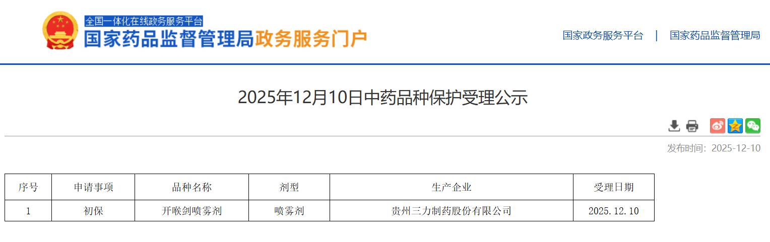 2025年12月10日中药品种保护受理公示