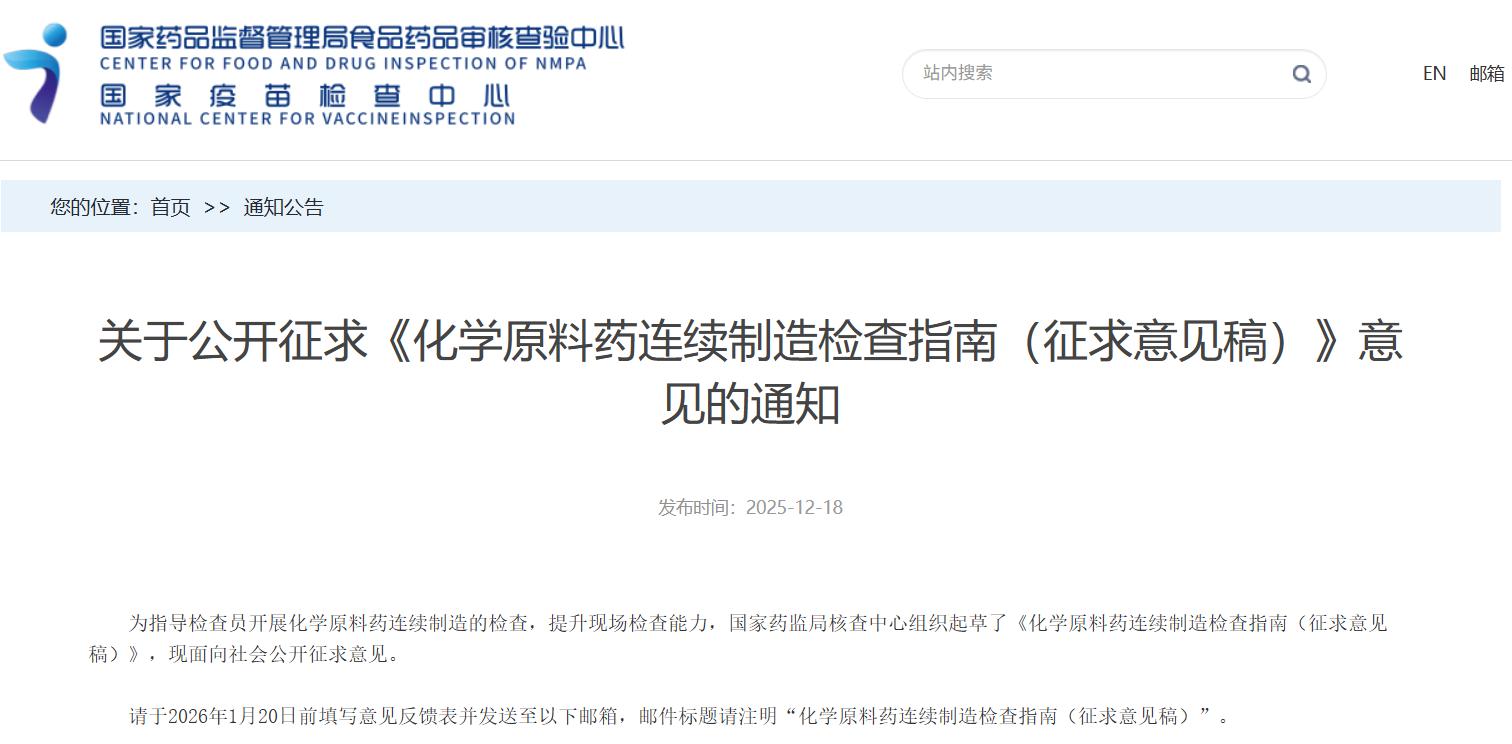 关于公开征求《化学原料药连续制造检查指南(征求意见稿)》意见的通知