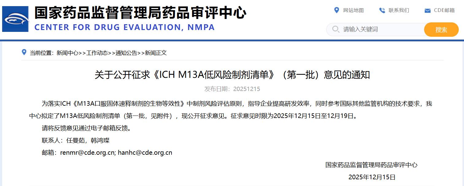 关于公开征求《ICH M13A低风险制剂清单》(第一批)意见的通知