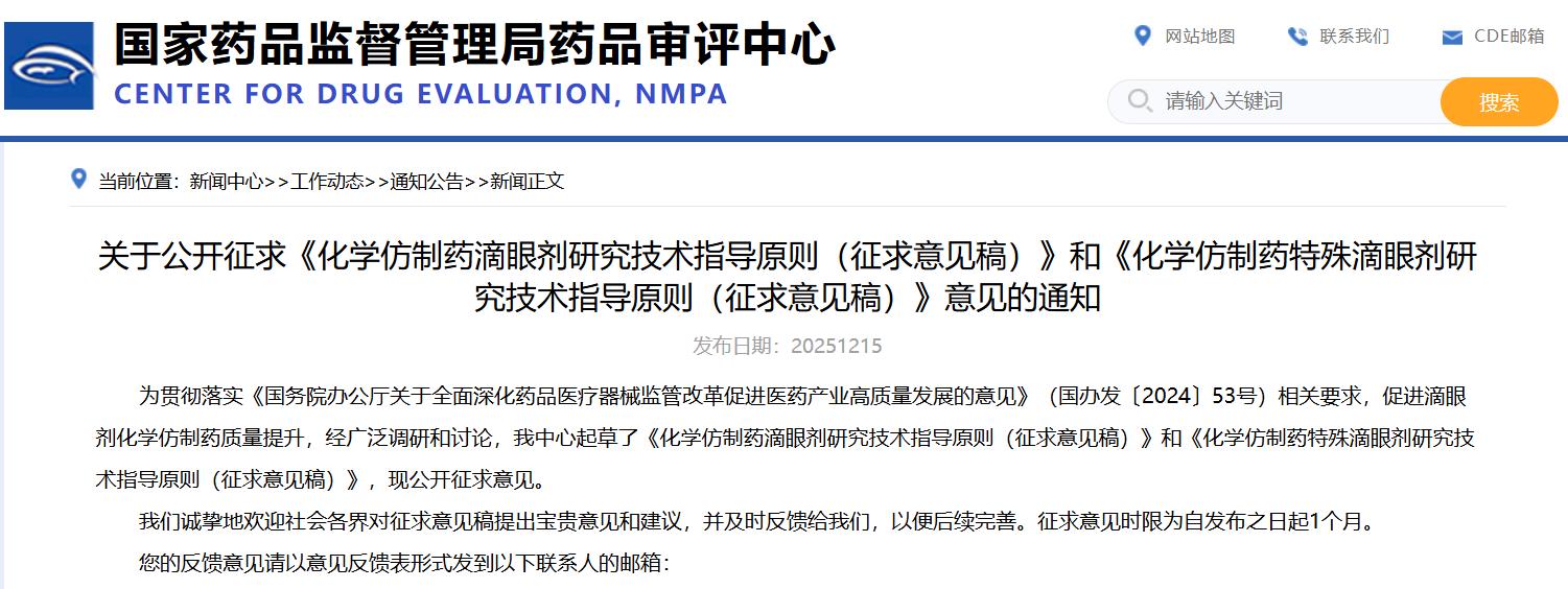 关于公开征求《化学仿制药滴眼剂研究技术指导原则(征求意见稿)》和《化学仿制药特殊滴眼剂研究技术指导原则(征求意见稿)》意见的通知